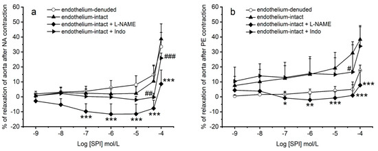 Vasorelaxant effects induced by SPI (spironolactone, 0.001–100 μmol/L) on endothelium-intact and -denuded aorta rings pre-contracted with (a) NA (noradrenaline, 1 μmol/L, n = 6) and (b) PE (phenylephrine, 1 μmol/L, n = 5) and in the presence of the inhibitors L-NAME (N(ω)-nitro-L-arginine methyl ester, an eNOS inhibitor, 100 µmol/L) and Indo (indomethacin, a non-selective COX inhibitor, 10 µmol/L). Data are presented as a percentage (%) of relaxation on maximal contraction induced by vasoactive agents. Each point represents mean values, and vertical lines are the S.D. of the mean. * (asterisk) represents differences between SPI vs. L-NAME + SPI in endothelium-intact rings (* p < 0.05, ** p < 0.01 and *** p < 0.001), and # (cardinal) shows significant differences between SPI vs. Indo + SPI in endothelium-intact rings (# p < 0.05; ## p < 0.01; ### p < 0.001), (p < 0.05, two-way ANOVA with interaction followed by Bonferroni’s post hoc t-tests).