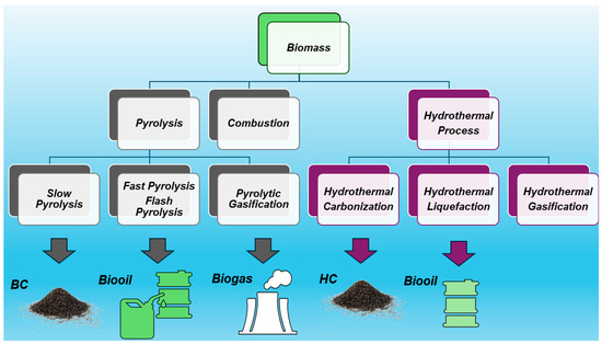 According to the definition provided by the International Biochar Initiative (IBI), biochar (BC) is “the solid material obtained from the thermochemical conversion of biomass in an oxygen-limited environment” [1]. Practically, BC is the lightweight black residue made mainly of carbon and ashes but also rich in aromatic systems and minerals produced by the thermal decomposition of organic material biomass, including wood, manure, leaves, waste, etc., under limited supply or in absence of oxygen (O2). Such a thermal decomposition process is referred to as pyrolysis. The most commonly used pyrolysis temperature is in the range of 400–600 °C [2], but a larger range of 200–1000 °C is reported [3]. When the thermal decomposition temperature is over 1000 °C and up to1600 °C, the process is named gasification. Pyrolysis comprises slow pyrolysis, fast pyrolysis, and flash pyrolysis, depending on the working temperature, the heating rate, and the residence time of the organic matter at a fixed temperature [4]. Upon the pyrolysis of biomass, three types of products with different physical states can form simultaneously in different concentrations. The solid residue comprises BC, which could contain ash and soot, bio-oils represent the liquid product, and the gaseous ones consist of syngas [4]. The relative yields of such products depend mainly on the pyrolysis temperature and heating rate, as shown in Figure 1.