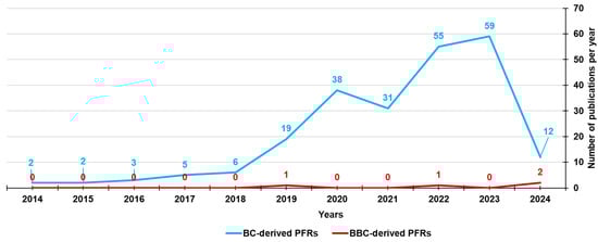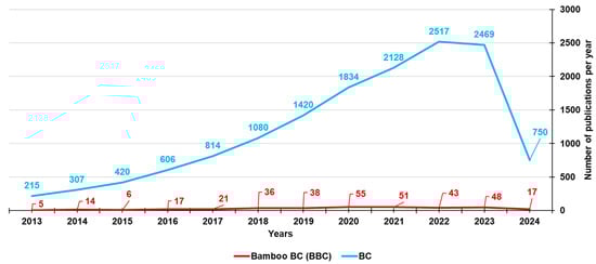 To date, the types of biomasses used to prepare BC and involved in the investigation of BC-bound PFRs mainly include lignocellulosic biomasses, such as pine needles, wheat straw, lignin, waste wood, cow manure, rice husk, and maize straw [23,35,36,37,38,39,40,41,42,43,44,45,46,47]. Lignocellulosic biomasses are made of hemicellulose, cellulose, and lignin. Despite the fact that bamboo may be a starting material almost perfect for synthesizing BC (BBC) and activated BBC (ABBC) due to its low cost, high biomass yield, and significantly accelerated growth rate, few researchers and scientists have used bamboo as a source for developing BC, as established by the number of publications on bamboo-derived BCs from the year 2013 until now (351) vs. those on BCs derived from different sources (14560) (Figure 4).