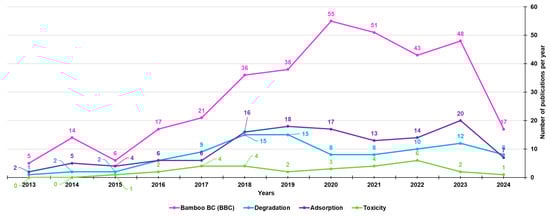 Number of papers on BBCs, as well as on BBC absorption, degradation and toxic properties, published from the year 2013 until now, according to the PubMed dataset. The survey was carried out using the keywords bamboo biochar (pink line); bamboo biochar AND adsorption (purple line); bamboo biochar AND degradation (light blue line); bamboo biochar AND toxicity (light green line).
