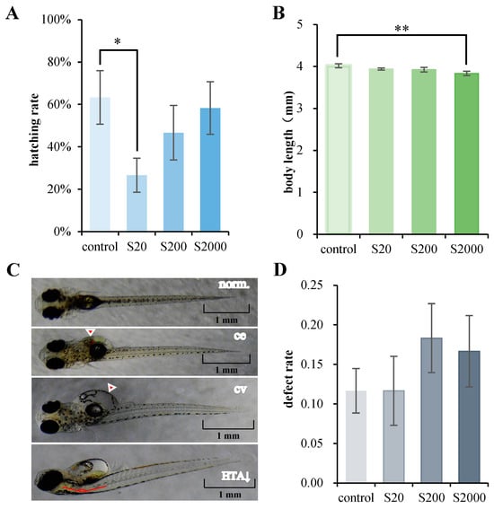 In the 15-day developmental exposure experiment, the actual mean measured concentrations of BPS in the 20, 200, and 2000 ng/L treatment groups were 16.6 ± 0.3, 167.3 ± 11.2, and 1735.3 ± 54.2 ng/L, respectively. In the following, these three BPS treatment groups are expressed as nominal concentrations and are referred to as S20, S200, and S2000, respectively. All embryos survived during the developmental exposure, indicating that the environmental concentration of BPS (20, 200, and 2000 ng/L) generally does not cause fatal effects in the early stages of Chinese medaka. We recorded and analyzed the growth parameters of juvenile fish, including hatching rate, heartbeat, and body length. The hatching rate of the S20 group significantly decreased (Figure 1A), and the body length of the S2000 group significantly decreased compared to the control (Figure 1B). There were no significant differences in heartbeat (Figure S2D).