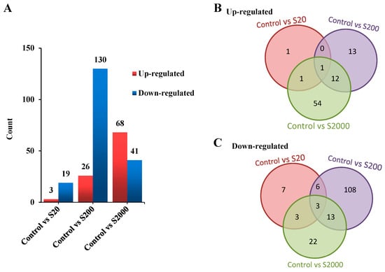 As shown in Figure 2B,C, one gene was up-regulated (Figure 2B), and nine genes were down-regulated (Figure 2C) in both the control vs. S20 and S200 comparisons. Two genes were up-regulated (Figure 2B), and six genes were down-regulated (Figure 2C) in both the control vs. S20 and S2000 comparisons. A total of 13 genes were up-regulated, (Figure 2B) and 16 genes were down-regulated (Figure 2C) in both the control vs. S200 and S2000 comparisons.