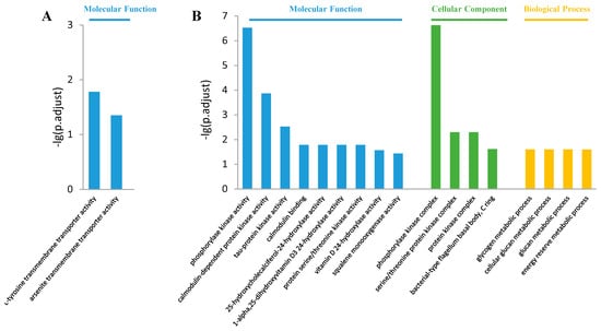 The most enriched GO terms in the control vs. S20 comparison are shown in Figure 3. In the molecular function class, the up-regulated DEGs were enriched in “L-tyrosine transmembrane transporter activity” and “arsenite transmembrane transporter activity”, while the down-regulated DEGs were enriched in “phosphorylase kinase activity”, “calmodulin-dependent protein kinase activity”, “tau-protein kinase activity”, “protein serine/threonine kinase activity”, “calmodulin binding”, “vitamin D 24-hydroxylase activity”, and “squalene monooxygenase activity” items (Figure 3A,B). In the cellular component class, only the down-regulated DEGs were enriched in “phosphorylase kinase complex”, “serine/threonine protein kinase complex”, “protein kinase complex”, and “bacterial-type flagellum basal body, C ring” items (Figure 3B). In the biological process class, only the down-regulated DEGs were enriched in “glucan metabolic process”, “glycogen metabolic process”, “cellular glucan metabolic process”, and “energy reserve metabolic process” items (Figure 3B).