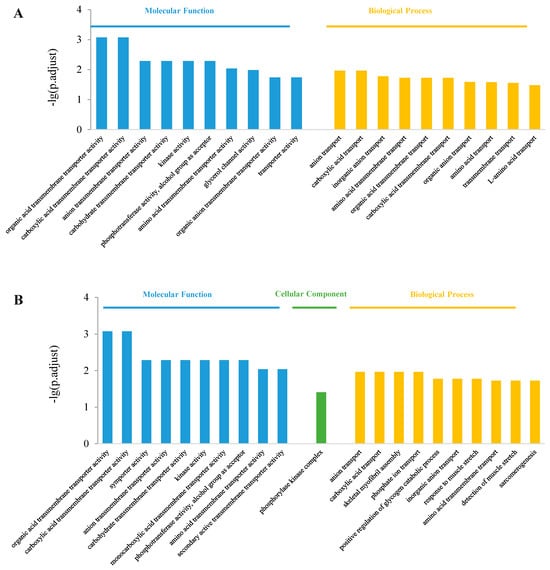 The top 10 enriched GO terms in the control vs. S200 comparison are shown in Figure 4. In the molecular function class, both up-regulated and down-regulated DEGs were enriched in “organic acid transmembrane transporter activity”, “phosphotransferase activity, alcohol group as acceptor”, “carboxylic acid transmembrane transporter activity”, “kinase activity”, “carbohydrate transmembrane transporter activity”, and “amino acid transmembrane transporter activity” items (Figure 4A,B). In the cellular component class, only down-regulate DEGs were enriched in the “phosphorylase kinase complex” item (Figure 4B). In the biological process class, both up- and down-regulated DEGs were enriched in “anion transport”, “carboxylic acid transport”, “inorganic anion transport” (Figure 4A,B). The up-regulated DEGs were also enriched in the “organic acid transmembrane transport” and “carboxylic acid transmembrane transport” (Figure 4A). While the down-regulated DEGs were enriched in the “skeletal myofibril assembly”, “response to muscle stretch”, “detection of muscle stretch”, and “sarcomerogenesis” items, which are related to movement (Figure 4B).