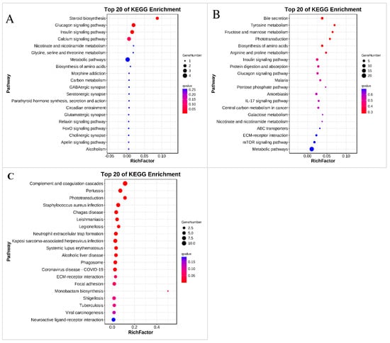 KEGG enrichment. (A) Top 20 enriched pathways of the DEGs in the control vs. S20 comparison; (B) Top 20 enriched pathways of the DEGs in the control vs. S200 comparison; (C) Top 20 enriched pathways of the DEGs in the control vs. S2000 comparison.