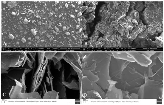SEM images depicting the synthesized graphene oxide (GO) (A,B), and graphene (nanoflakes) (C,D). SEM images adapted from our previous studies [24,27].