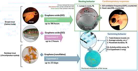 To enhance understanding and supplement existing data on the effects of GBNs on freshwater salmonids, this study examined the short-term (4 days) and long-term (23 days) impacts of graphene (nanoflakes) and GO on brown trout (Salmo trutta) and rainbow trout (Oncorhynchus mykiss) at various developmental stages (larvae and juveniles). Utilizing the popular form of graphene (nanoflakes) and the more economical and extensively studied GO as its precursor, we assessed physiological parameters such as heart rate (HR) and gill ventilation frequency (GVF), along with nesting rate and swimming activity. These analyses aimed to elucidate the influence of these carbon nanomaterials at both physiological and whole-organismal levels, providing insights into early stage fish behavioral traits that could impact their survival.