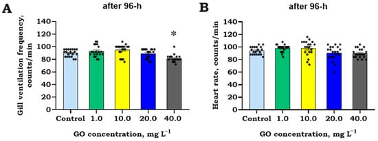 Gill ventilation frequency (GVF) (count/min), (A) and heart rate (HR) (count/min), (B) (mean ± SEM, raw data, n = 20) during 96 h exposure trials exposure to different concentrations of graphene oxide (GO). Asterisks (*) denote significant differences between treatments compared to the control level at significance levels of p < 0.05 (*).