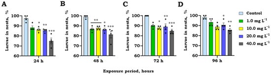 Number of brown trout (S. trutta) larval individuals (1 day after hatching) in nests (%) (A) (mean ± SEM, raw data, n = 4 repl.) after 24 h (A), 48 h (B), 72 h (C), and 96 h (D) exposure to different concentrations of graphene oxide (GO). Asterisks (*) denote significant differences between treatments compared to the control observational timeframe at significance levels of p < 0.05 (*), <0.01 (**), and <0.001 (***).