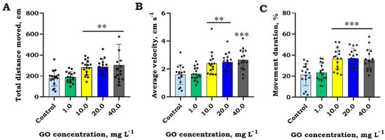 Total distance moved (cm) (A), average velocity (cm/s) (B), and (cumulative) movement duration (%) (C) (mean ± SEM, raw data, n = 16) for brown trout (S. trutta) juveniles after 2 h of exposure to different concentrations of graphene oxide (GO). Asterisks denote significant differences between treatments compared to the control observational timeframe at significance levels of p < 0.01 (**), and < 0.001 (***).