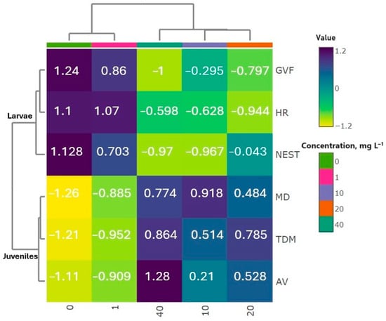 The hierarchical cluster analysis (HCA) revealed distinct groupings among the studied fish (brown trout) (Figure 6). The first cluster included S. trutta larvae and juveniles exposed to 1.0 mg L−1 GO, along with the control group, indicating similar behavioral responses. In the second major cluster, fish treated with 10.0 and 20.0 mg L−1 GO formed one subcluster, while those exposed to 40.0 mg L−1 GO comprised another. This detailed categorization highlights nuanced variations in fish responses to different GO concentrations, emphasizing concentration-dependent effects and the significance of dosage levels in shaping observed behavioral patterns.