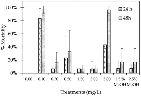 % Mortality A. salina at 24 and 48 h of exposure. Significant differences were found between treatments at both time points (p < 0.05). The average is presented with the standard deviation (n = 3).