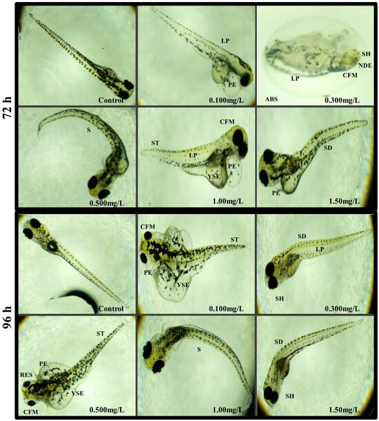 Zebrafish eleutheroembryos exposed to BP-3 for 72 and 96 h. Morphological changes in embryos exposed to BP-3 after hatching include pericardial edema (PE), spinal deformities (SD), scoliosis (S), yolk sac edema (YSE), lack of pigmentation (LP), reduced eye size (RES), abnormal body shape (ABS), non-development of eyes (NDE), small head (SH), craniofacial malformation (CFM), and short tail (ST). No morphological changes were found in the control group.