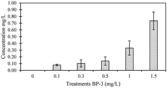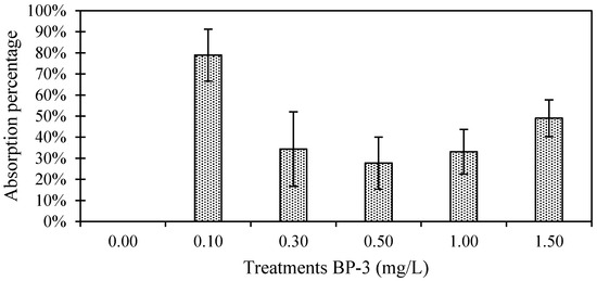 To validate the method, five spikes were performed for analysis, with recovery percentages ranging from 98% to 107%. Spike and recovery analyses were employed to assess whether the matrix complexity of biological samples influenced analyte detection. The limit of quantification was 0.012 mg/L, and the limit of detection was 0.004 mg/L. No detectable BP-3 concentration was observed in the control group. Variations in eleutheroembryo numbers due to exposure-related mortality were noted across all groups. The wet weights of the exposed samples ranged from 0.0064 g to 1.1163 g, revealing significant differences among the treatments (p < 0.05). The highest BP-3 concentration (0.74 ± 0.13 mg/L) was observed in the group exposed to 1.5 mg/L BP-3 (Figure 4). BP-3 has been detected at concentrations up to 123 ng/g lipid in fish [5]. Conversely, the group with the lowest BP-3 concentration was exposed to 0.1 mg/L, registering at 0.079 ± 0.012 mg/L. Notably, the group exposed to 0.1 mg/L exhibited the highest percentage of BP-3 absorption at 79 ± 0.12%, while the group with the lowest absorption percentage was exposed to 0.50 mg/L, obtained 28 ± 0.12% (Figure 5).