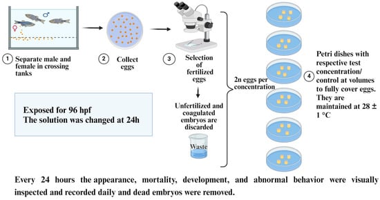 Scheme of the zebrafish embryo toxicity test procedure. Modified image [15]. Created using BioRender.com (accessed on 27 December 2023). Experimental settings for egg production and collection, pre-exposure immediately after fertilization in glass Petri dishes, selection of fertilized eggs with a stereomicroscope, and distribution of fertilized eggs into Petri dishes prepared with their respective test concentrations.