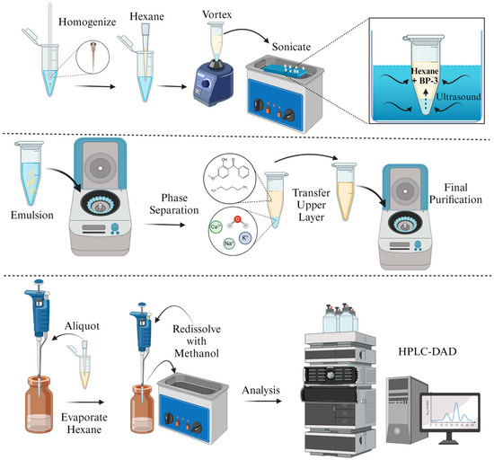 The extraction method for BP-3 from the tissue presented here is an innovative approach that is not found in the current literature. This method was developed by applying the principles of green chemistry, emphasizing waste reduction, heightened energy efficiency, use of a singular solvent for extraction, and incorporation of microvolumes. Additionally, our methodology adhered to the principles of the 3Rs in biomedical research (Replacement, Reduction, and Refinement), employing zebrafish embryos as a small-scale model. Extractions were performed on samples containing a limited quantity of embryos, ranging from 25 to 45. This novel BP-3 extraction method is much simpler as it does not require the use of cartridges or expensive separation equipment, which typically results in the disposal of a significant amount of organic waste, as is the case with the most commonly used solid-phase extraction technique.