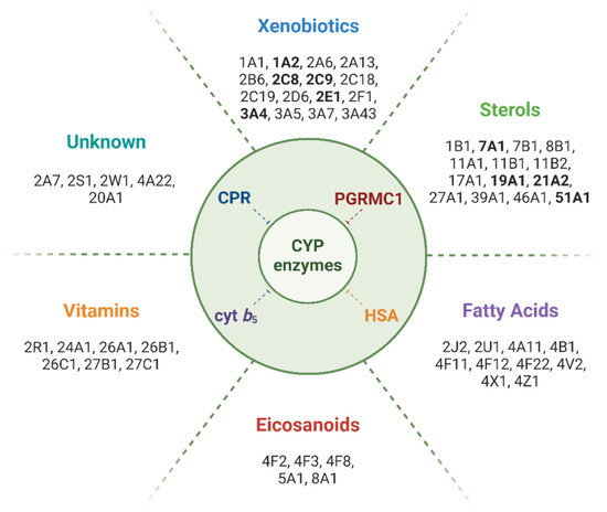 Main classes of compounds metabolized by CYPs and isoforms involved in their biotransformation. Human CYP isoforms for which binding or enzyme activity modulation by PGRMC1 has been reported are highlighted in bold. Note: To the best of our knowledge, no direct effect of PGRMC1 has been reported for CYP isoforms metabolizing fatty acids, eicosanoids, or vitamins, or for those whose substrate class is unknown.