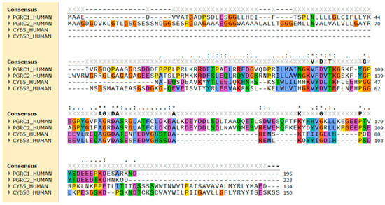 Sequence alignment of the amino acid sequence of human PGRMC1 (PGRC1), PGRMC2 (PGRC2), cytochrome b5 type A (CYB5), and type B (CYB5B). The alignment was performed using Clustal Omega and amino acid residues were colored by properties + conservation (Clustal X) in the SnapGene 7.0.3 software. Conserved hydrophobic amino acids are in blue, positively charged in red, negatively charged in magenta, polar in green, glycine in orange, and aromatic amino acids in cyan.