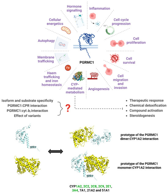 A myriad of pathways for which PGRMC1 has reported involvement, focusing on the relevance of a role in CYP-mediated metabolism. Represented are the prototypes for the interaction between PGRMC1 (in blue) and CYP1A2 (in yellow), predicted using the protein docking online tools ClusPro and HDOCK [269,270]. The ClusPro model was based on the crystal structures of the PGRMC1 dimer (PDB 4 × 8Y) and of CYP1A2 (PDB 2HI4), while HDOCK predicted the interaction model with the PGRMC1 monomer. Human CYP isoforms reported to interact with PGRMC1 [130,134,137,151,160] are noted, and highlighted in green are the CYPs belonging to families majorly involved in drug metabolism. Figure was created with BioRender.com, proteins are not to scale.