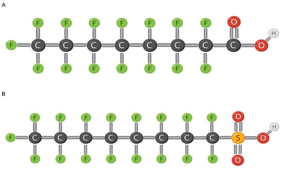 Chemical makeup of PFOS (A) and PFOA (B). Modified from [5] (A) and [6] (B). Created with Biorender.com (accessed on 26 January 2024).