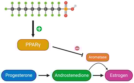 Schematic of estrogen synthesis impaired by PFAS. Created with Biorender.com (accessed on 25 April 2024).