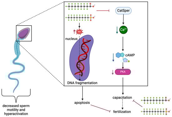Leydig cell hyperplasia, commonly found in infertile men, can occur as a result of PFAS exposure resulting in lower testosterone levels [31]. The stimulation by LH of the AC-PKA-CREB-StAR leads to increased cholesterol entry in the mitochondria and hence to increased testosterone synthesis by Leydig cells. This pathway, along with the differentiation of stem Leydig cells, is inhibited by PFOS. Moreover, PFOS and PFOA increase ROS in sperm cells similarly to their effects in the ovum [60]. Interestingly, a mild ROS level helps activate tyrosine protein phosphorylation which in turn induces capacitation. However, a high ROS level is very toxic to sperm cells as generating oxidative stress triggers lipid peroxidation, dysfunction of the mitochondria, and DNA damage, all of which are harmful to the male reproductive system [58,60].