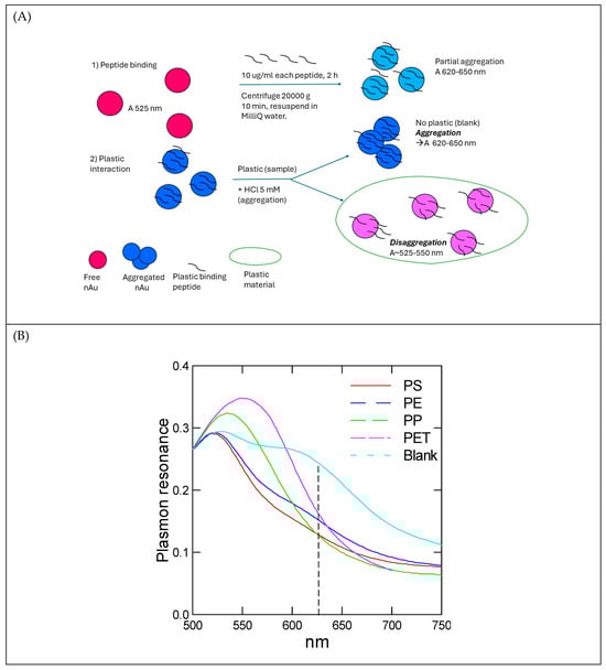 PP and PE nanoparticles (0.1 µm diameter) were obtained from CD Bioparticles (New York, NY, USA). PS (0.1 µm diameter) and PET nanoparticles (1–3 µm diameter) were purchased from Polyscience (Niles, IL, USA) and nanoChemazone (Leduc, AB, Canada), respectively. The plastic samples were diluted at 10 mg/mL in MilliQ water. Previous experiments revealed that nanoparticle preparation in MilliQ water maintained the Zeta potential and prevented aggregation of the nanoparticles. For the assays, a standard curve between 1 and 100 µg/mL was constructed in MilliQ water at the day of the experiment. For the assay, 100 µL of nAu–peptide (either PE, PET, PP, or PS) was added to a clear microplate and increasing amounts of the corresponding target plastic were added and mixed for 5 min. After the addition of the aggregation agent (10 µL of 0.1 M HCl), plasmon resonance between 500 and 750 nm was measured using a microplate reader (Neo-2, Synergy, Biotek instrument, Santa Clara, CA, USA). The disaggregation ratio was calculated by the absorbance ratio at 525/620 nm. The specificities of each peptide against PE, PET, PP, and PS plastics were also determined. Each nAu–peptide was tested with the other non-target plastics (e.g., nAu-PS peptide tested with PE, PET, and PP and so forth) to determine any binding to the non-target plastics.