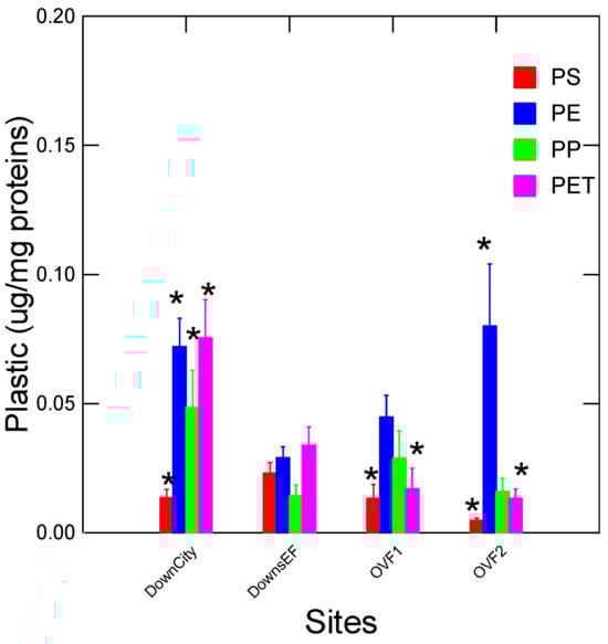 Relative levels of various types of plastics in freshwater mussels. The relative levels of plastics were obtained by correcting for interference using the residual method, as determined in Table 2. Data are expressed as the mean with standard error. The star symbol * indicates significance from the Down Effluent site.