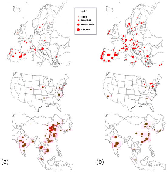 Highest levels of fluoroquinolones detected in surface waters (a) and WWTP effluents (b) of Europe, the USA, and Asia. The red spot size indicates the concentration range (see inset). Data are obtained from [24,25,33,40,41,42,46,48,49,50,51,52,53,54,55,56,57,58,59,60,61,62,63,64,65,66,67,68,69,70,71,72,73,74,75,76,77,78,79,80,81,82,83,84,85,86,87,88,89,90,91,92,93,94,95,96,97,98,99,100,101,102,103,104,105,106,107,108,109,110,111,112,113,114,115,116,117,118,119,120,121,122,123,124,125,126,127,128,129,130,131,132,133,134,135,136,137,138,139,140,141,142,143,144,145,146,147,148,149,150,151,152,153,154,155,156,157,158,159,160,161,162,163,164,165,166,167,168,169,170,171,172,173,174,175,176,177,178,179,180,181,182,183,184,185,186,187,188,189,190,191,192,193,194,195,196,197,198,199,200,201,202,203,204,205,206,207,208,209,210,211,212,213,214,215,216,217,218].