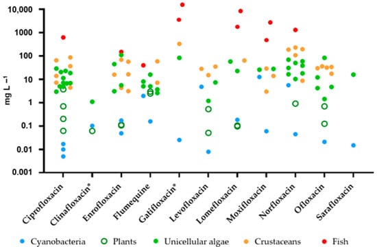 EC50 values (mg L−1) of fluoroquinolones in different freshwater taxa. Data are obtained from references listed in Table 1. * compounds that have been withdrawn from the market.