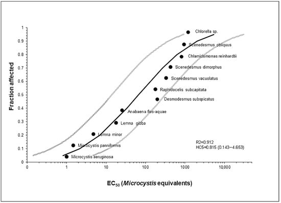 When data are available for a reasonable number of species, a risk evaluation can be performed using the methodology outlined in [308]. Accordingly, results from eleven distinct FQ compounds across twelve diverse autotroph species were amalgamated in a Species Sensitivity Distribution (SSD) curve. By normalizing the acute toxicity values (EC50s) of each FQ to its EC50 in M. aeruginosa, the freshwater cyanobacterium highly sensitive to all FQs tested, the EC50s were expressed as Microcystis-equivalents, enabling cross-FQs pooling. The set of geometric mean Microcystis-equivalent EC50s (Table 2) was then analyzed using the USEPA SSD Generator V1, available at [309]. The endpoints considered to build the nSSD were: growth/yield inhibition (48 or 72 h) for cyanobacteria and unicellular algae, and seven-day growth/yield inhibition for plants. The decision to limit the nSSD curve to autotrophic species is motivated by the fact that they are more sensitive than heterotrophs to FQs and that, consequently, a safety threshold calculated for them can be a guarantee for all freshwater species.