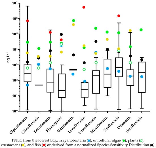 For the majority of compounds, the highest reported concentration is higher than the PNEC obtained by applying an assessment factor of 100 to the lowest EC50 in cyanobacteria. This is not surprising as the level of contamination in some specific areas of some countries in the Far East is extraordinarily high, mainly due to the activities of pharmaceutical companies and fish farms. Interestingly, with four FQs largely used in human medicine, namely ciprofloxacin, norfloxacin, ofloxacin, and sarafloxacin, even the median of the highest concentration detected in the aquatic environment is higher than the PNEC calculated in the traditional way; moreover, for two additional human pharmaceuticals (moxifloxacin and levofloxacin), the median is less than one order of magnitude lower than the PNEC. With regard to veterinary compounds, enrofloxacin, with a PNEC only an order of magnitude lower than the median, is still widely used in food-producing animals and could pose a risk to the aquatic environment in the years to come, particularly in countries where its use is also permitted in aquaculture. Notably, according to [316], six of the eleven largest aquaculture-producing countries currently use enrofloxacin.