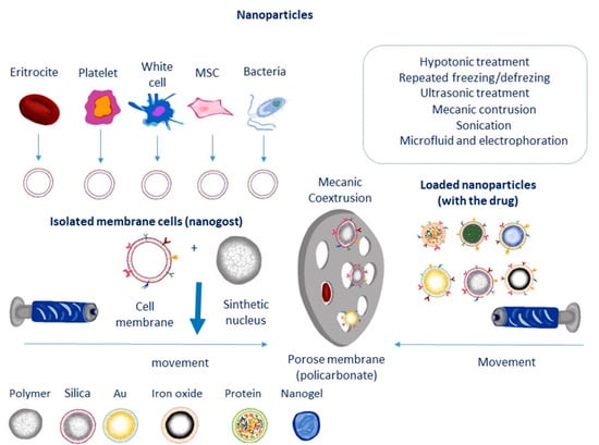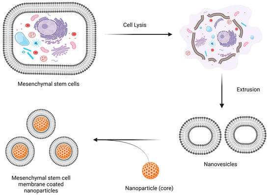 The bilayer of phospholipids that makes up the cell membrane is composed of various glycoproteins, polysaccharides, and integral membrane proteins [68]. The use of a pure cell membrane makes sense since it enhances the development of cell membrane-coated mimics by maximizing the effectiveness and uniformity of surface coatings while imitating as many of the functions of the original cell as possible. Bone marrow, umbilical cord, or adipose tissue can all be used to collect mesenchymal stem cells, which are less invasive and produce higher results [69]. The manufacture of cell membrane-coated nanoparticles mainly involves three processes: nanoparticle cores are manufactured, cell membrane-derived vesicles are created and separated, and then cell membrane-derived vesicles and nanoparticle cores are fused together [70]. To remove the cytoplasm from mesenchymal stem cells, they are first lysed using hypotonic lysis solutions [71], or by repeatedly freezing and thawing them [72]. Subsequently, they may undergo homogenization or sonification in order to reduce their size. Second, to make the mesenchymal stem cell membrane, the product is extracted using centrifugation and then repeatedly extruded from porous polycarbonate membranes with pore widths ranging from 200 to 400 nm [73], thus raising mesenchymal stem cell membranes. Maintaining cell membrane-derived vesicles below −20 °C is necessary to ensure membrane protein stability over long term [74].