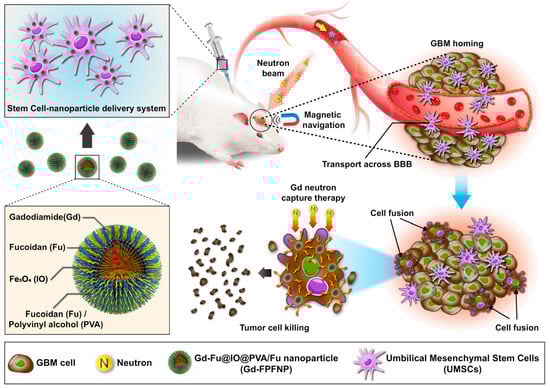 Gadolinium-iron-oxide and polyvinyl alcohol-based nanoparticulate system associated with the mesenchymal stem cells derived from the umbilical cord which possess the capability for crossing the blood brain barrier and can become fused with cancerous cells under magnetic navigation for improved neuron capturing therapeutics (reprinted from [61]).