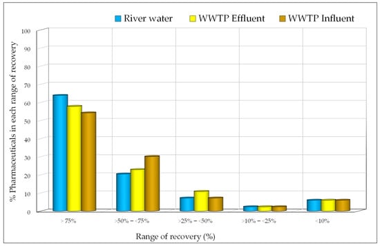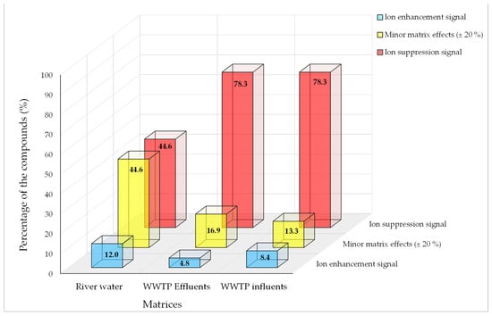 Matrix effects (ME) in river water, WWTP effluent, and WWTP influent were assessed using the equation presented in Figure S3 (Supplementary Materials). As expected, in general, higher ME was observed in wastewaters when compared with surface water (Figure S4). The highest ion enhancement was observed for lansoprazole in river water, tetracycline in WWTP effluent, and oxytetracycline in WWTP influent matrices and the highest signal suppression was observed for rimonabant in river water, naproxen in WWTP effluent, and erythromycin in WWTP influent, respectively. It is important to highlight that atorvastatin and the antibiotics azithromycin, oxytetracycline, tetracycline, doxycycline, and chlorocycline were the pharmaceuticals with ion enhancement in all matrices. In the river water matrix, 44.6% of analytes showed minor ME and ion suppression. In wastewater matrices, 78.3% displayed ion suppression. Ion enhancement was observed for 12.0%, 4.8%, and 8.4% of compounds in river water, WWTP effluent, and WWTP influent matrices, respectively (Figure 2).
