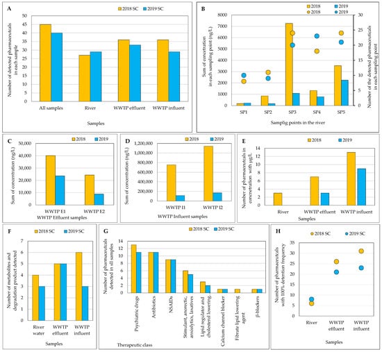 Results for each type of sample (river water and WWTP effluent and influent samples) in the sampling campaigns performed in 2018 and 2019: (A) Number of detected pharmaceuticals; (B) Sum of the concentrations and number of detected pharmaceuticals in each sampling site; (C) Sum of the concentrations of detected pharmaceuticals in WWTP effluent samples; (D) Sum of the concentrations of detected pharmaceuticals in WWTP influent samples; (E) Number of pharmaceuticals with concentration at µg/L level, (F) Number of metabolites and degradation product; (G) Number of pharmaceuticals detected by therapeutic class; and (H) Number of pharmaceuticals with 100% of detection frequency.
