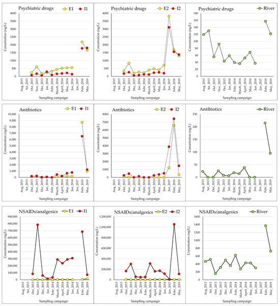 A total of 111 samples were analyzed from 2013 to 2019: 65 samples from river locations, 11 samples from WWTP E1 and I1, and 12 samples from WWTP E2 and I2. The results are summarized in Tables S13 to S21 (Supplementary Materials), with concentrations on graphs (Figure 4) representing sums within therapeutic families. River sample results are averages across five sampling points.