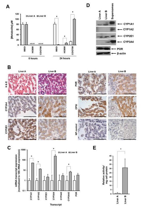 Concentrations of M8OI and its metabolites in human hepatocyte cultures. (A) Hepatocytes were isolated from Liver A or Liver B and cultured as outlined in the Materials and Methods Section. Hepatocytes were incubated with 100 μM M8OI and the concentrations of M8OI, HO8IM and COOH7IM were determined in triplicate cultures directly (within 5 min) after addition and after 24 h. Concentrations were determined by reference to authentic standards. * p > 0.95. (B) H & E or immunohistochemical staining of liver sections from Liver A and Liver B for the indicated protein. For CYPs, a centrilobular region of the lobule is shown. POR, cytochrome P450 oxidoreductase; CPSI, carbamylphosphate synthase I (a liver-specific protein). Bar = 100 μm. (C) qRT-PCR for the indicated transcripts in hepatocytes isolated from Liver A and Liver B. RNA was isolated from 3 aliquots of cells and transcript levels were determined after normalisation to 18S rRNA levels. Normalised expression for each transcript was then expressed relative to the normalised level present in Liver A. * p > 0.95. (D) Western blot for the indicated protein from hepatocytes isolated from the indicated liver. Note: liver extracts, 20 µg protein/well; supersomes, 2 µg protein/well. (E) Luciferin PPXE activities. Data are the mean and SD of 3 determinations from each extract and are normalised to total protein levels. * p > 0.95.