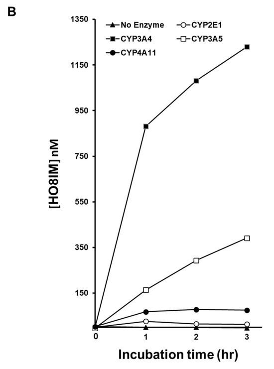 Quantitation of HO8IM production over time demonstrates that CYP3A4 was the most active of the CYPs examined (Figure 3B). CYP3A5 was also moderately active, whereas CYP2E1 and CYP4A11 mono-oxygenated M8OI at relatively slow rates (Figure 3B).