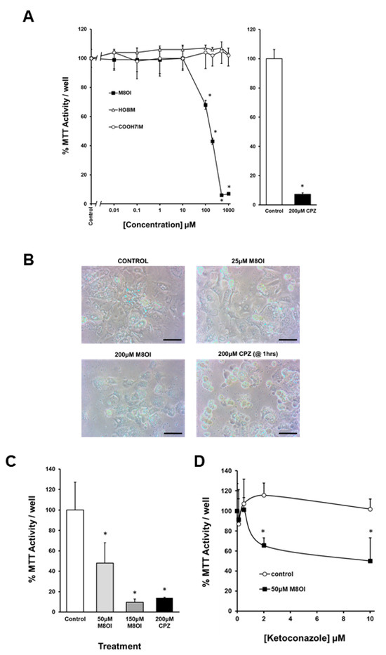 The toxicity of M8OI in human hepatocytes is potentiated by the inhibition of its metabolism. (A) Left panel, human hepatocytes (NHL5) were treated with increasing concentrations of either M8OI, HO8IM or COOH7IM for 24 h, or right panel, 200 μM chlorpromazine (CPZ) for 1 h; control hepatocytes were treated with a 0.1% v/v DMSO vehicle. For MTT reduction, the data are the mean and SD of 4 separate determinations from the same donor. * p > 0.95 using Student’s t-test. (B) Photomicrographs of hepatocytes treated for 24 h as indicated, unless otherwise indicated. Bar = 100 μm. (C) Cryopreserved cultured hepatocytes treated for 24 h as indicated (except CPZ: 1 h). For MTT reduction, the data are the mean and SD of 4 separate determinations. Shown is the statistically significantly different % MTT activity versus the control (2-tailed, p < 0.05 level) using Student’s t-test. (D) Cryopreserved cultured hepatocytes treated for 24 h with or without 50 μM M8OI and increasing concentrations of ketoconazole. For MTT reduction, the data are the mean and SD of 4 separate determinations. * Statistically significantly different % MTT activity versus equivalent ketoconazole-free cultures (2-tailed, p < 0.05 level) using Student’s t-test. Note: chlorpromazine leads to hepatocyte death via necrosis [30].