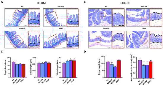 Male mice were exposed for 6 months to Mod Box e-cig at two power settings (Mb18W and Mb30W groups), CS (3R4F group), or conditioned air (Air group) by nose-only inhalation. First, levels of cotinine, a major metabolite and surrogate marker for nicotine, were measured [35]. As shown in Supplementary Figure S1, plasma cotinine levels gradually and significantly increased in Mb18W-, Mb30W-, and 3R4F-exposed mice compared to Air-exposed mice (p < 0.0001). Gut mucosal structure was assessed in MGG-stained sections of ileum and colon (Figure 1A,B). In the ileum, villus length and crypt depth did not vary between the groups, although there was a trend to a lower crypt depth in Mb18W-, Mb30W-, and 3R4F-exposed mice (Figure 1C). The villus length/crypt depth ratio was significantly increased in Mb30W- and 3R4F-exposed mice, suggesting a dysregulation of ileal cell proliferation. In the colon, the crypt depth and the mucosal surface area were measured (Figure 1D). In contrast with CS-exposed mice, both parameters were reduced in Mb18W- and Mb30W-exposed mice, suggesting a decrease in colon cell proliferation by e-cig exposure.