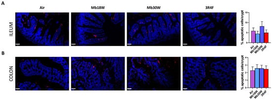 The TUNEL assay was used to determine whether the histomorphological impairments may be linked with apoptosis. The TUNEL assay detects DNA breakage by labelling free 3′-hydroxyl termini. Because genomic DNA breaks occur during early and late stages of apoptosis, TUNEL staining continues to be widely used to measure apoptotic cell death. In our study, the number of apoptotic cells per crypt was not modified in either the ileum or the colon by e-cig and CS exposure (Figure 2A,B).