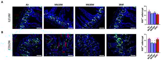 The effects of e-cig and CS inhalation were evaluated on ileum- and colon-cell proliferation. Whereas there was no change in the ileum (Figure 3A), exposure to Mb18W and Mb30W reduced the number of Ki-67-positive cells per crypt in the colon, suggesting that the crypt loss was caused by decreased cell proliferation in the colon (Figure 3B). CS did not modify the Ki-67-positive cell number in either the ileum or colon.