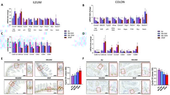 Lastly, cyclin D1 immunohistochemical staining was performed (Figure 4E,F). As observed for the gene transcript levels, measurement of cyclin D1 staining intensity demonstrated that Mb30W and 3R4F exposure significantly increased cyclin D1 protein levels in the ileum, and, in contrast decreased, them in the colon (Figure 4E,F). Overall, our results showed that proliferation signalling is impaired in the ileum and colon by e-cig and CS exposure, particularly in the cell cycle pathway, and these disturbances are associated with increased and decreased cyclin D1 protein expression the in ileum and colon, respectively.