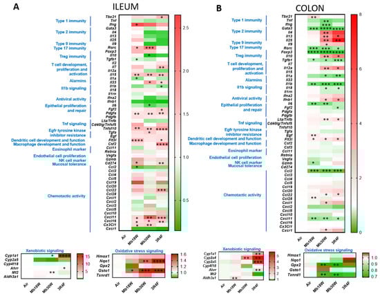 In the ileum, Mb18W exposure induced an upregulation of interferon gamma Ifng, FMS-like tyrosine kinase 3 ligand Flt3l and CD274 antigen Cd274 (also called Pdl1) and a downregulation of transforming growth factor beta 1 Tgfb1, interleukin 1 alpha Il1a, and C-C motif chemokine ligand 2 Ccl2 (also called MCP-1) expression compared to control mice (Figure 5A). Mb30W exposure decreased Il10 and Il60 and increased Il33, Tgfa, Cytochrome P450 1A1 Cyp1a1, Metallothionein 2 Mt2, and NAD(P)H dehydrogenase quinone 1 Nqo1 mRNA levels. Both Mb18W and Mb30W upregulated the Th17 transcription factor nuclear receptor ROR-gamma Rorc, Il15, platelet-derived growth factor subunit A Pdgfa, tumor necrosis factor ligand superfamily member 10 Tnfsf10 (also called Trail), C-X-C motif chemokine 11 Cxcl11, Cxcl16, Fractalkine Cx3cl1 and glutathione S-transferase omega-1 Gsto1 expression. Exposure to CS decreased Il1b and increased the Th1 transcription factor T-box transcription factor TBX21 Tbx21 (also called T-bet), Il7, Il15, Il33, fibroblast growth factor 2 Fgf2, Pdgfa, Tnfsf10, Flt3l, granulocyte-macrophage colony-stimulating factor Csf2, Cd274, Ccl22, Cxcl11, Cxcl16, Cyp1a1, Aryl hydrocarbon receptor repressor Ahrr, Nqo1, and Gsto1 transcription. Overall, our data argue in favour of increased ileal chemotactic activity and oxidative stress induced by both e-cig and CS. By contrast, activity of MPO, a well-established neutrophil marker and an important regulator of immune system function [37], was quantified. MPO activity was decreased by both Mb30W e-cig and CS exposure in the ileum (Supplementary Figure S2).