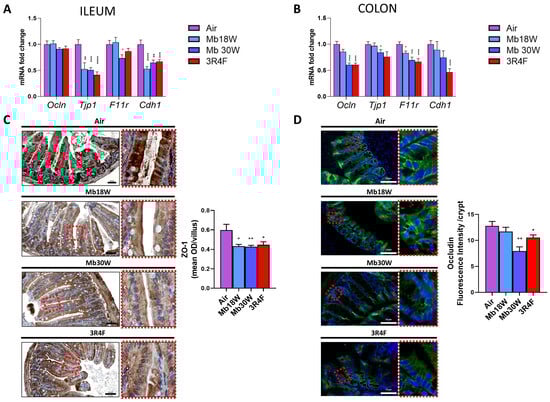 In the ileum, decreased levels of F11r were found in Mb30W-exposed mice, and reduced levels of Tjp1 and Cdh1 were observed following Mb18W, Mb30W, and 3R4F exposure (Figure 6A). In the colon, 3R4F exposure downregulated the expression of Ocln, F11r, and Cdh1 (Figure 6B). Relative levels of Ocln and Tjp1 were reduced by Mb30W exposure, and F11r levels were diminished in both Mb18W and Mb30W groups. To explore if these transcriptional disturbances were associated with a decrease in junction protein, we performed immunohistochemical staining of the two most impaired proteins by e-cig and CS in the ileum and colon, respectively, ZO-1 and occludin. In the ileum, we confirmed that Tjp1 mRNA downregulation was associated with ZO-1 protein under-expression (Figure 6C). Moreover, in the colon, the downregulation of Ocln transcripts levels was corroborated by decreased levels of occludin protein following Mb30W and CS exposure (Figure 6D). In conclusion, our data suggest that both vaping and conventional smoking compromised barrier integrity in the ileum and colon.