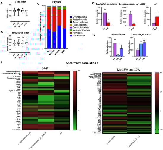 Effects of chronic electronic and conventional cigarette exposure on gut microbiota. n = 14 per group. (A) Box plots representing Chao α-diversity index. (B) Box plots representing Bray–Curtis β-diversity index. * p < 0.05, *** p < 0.005, as determined by the Kruskal–Wallis test. (C) Differential abundance of bacterial phyla. (D) Differential abundance of significantly changed bacterial genera in the 3R4F group compared to the control Air group. (E) Differential abundance of significantly changed bacterial genera in e-cigarette-exposed groups compared to the Air group. (D,E) * p < 0.05, ** p < 0.01, and **** p < 0.001 compared to the Air group, as determined by the Mann–Whitney U test. (F) Heatmaps of Spearman’s rank correlation between the abundance of the changed gut microbiota and the levels of changed colon parameters in 3R4F-exposed mice (left) and Mb18W- and Mb30W-exposed mice (right).