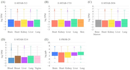 Boxplot of the expression value for the tissue-specific gene expression datasets of (A) E-MTAB-513, (B) E-MTAB-1733, (C) E-MTAB-2836, (D) E-MTAB-5214, (E) E-PROB-29.