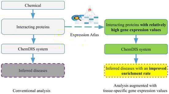Compared to conventional methods considering all interacting proteins, the proposed method incorporates tissue-specific gene expression data to augment disease inference. The incorporation of tissue-specific gene expression information adds an additional step for filtering out the interacting proteins with relatively low expression identified in the above-mentioned first step. Specifically, the thresholds for low, medium, and high expression levels defined in the previous section were applied to filter out interacting proteins with relatively low expression levels. The remaining proteins were then utilized for enrichment analysis. In this way, the enrichment analysis will be conducted using only proteins with relatively abundant gene expression levels. Figure 2 shows the system flow of the two methods.