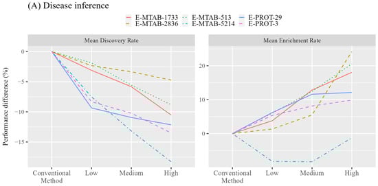 The highest enrichment rates were achieved by applying the filter of high-expression level, i.e., only genes/proteins with very high expression values were utilized for enrichment analysis. Compared to the conventional method, the three tissues with the highest improvement in average enrichment rate are the heart, liver, and kidney with 34.21%, 24.65%, and 19.93% improvement, respectively. The use of the heart-specific expression data of E-MTAB-2836 yielded the highest improvement of 44.79% in the enrichment rate. Please note that this study considered only the annotated DO terms obtained from the CTD database. Since there could still be undiscovered chemical–disease associations, the enrichment rate could be underestimated. As the curation process may prefer a higher level DO term representing a general concept rather than a specific one, the augmented analysis with fewer interacting proteins may tend to predict DO terms of lower levels for more specific diseases and miss the DO terms consisting of a high number of involved proteins. In this aspect, in addition to the enrichment rate improvement, the benefit obtained from the augmented analysis for identifying more specific DO terms is considered more useful for analyzing chemical–disease associations.